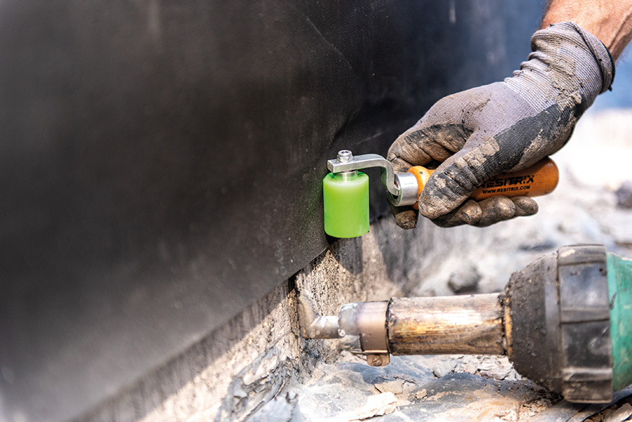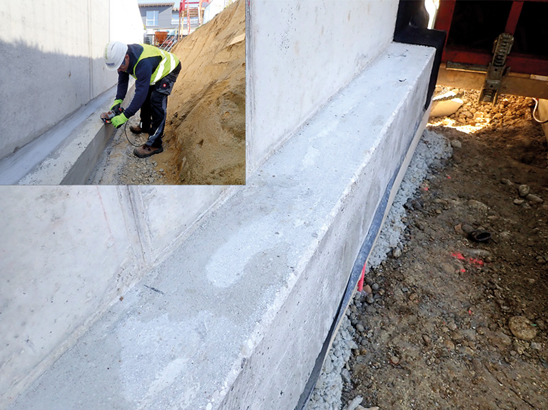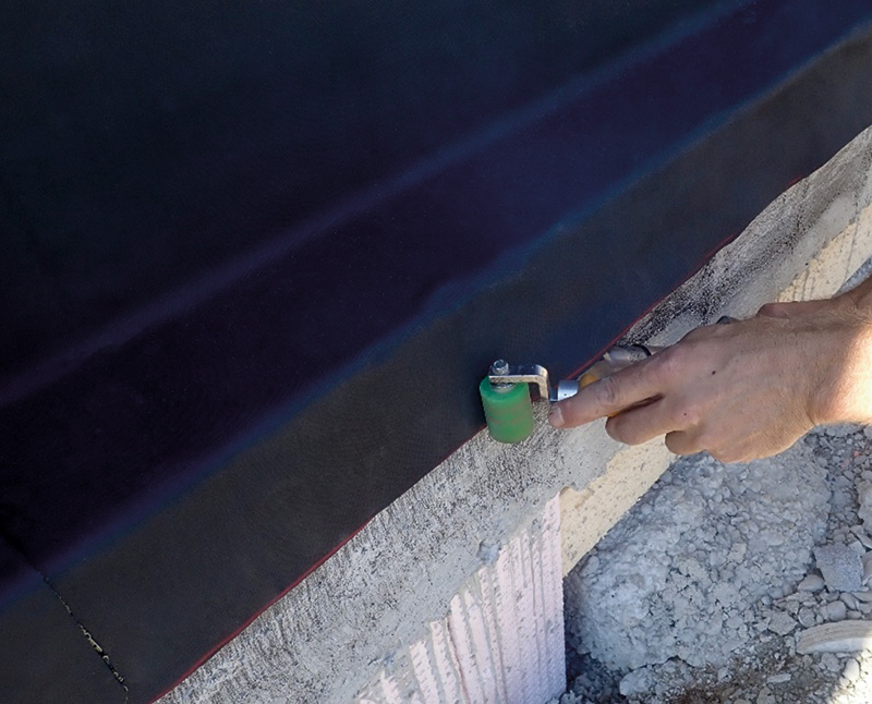 RESITRIX® SKW kann auf folgenden Untergründen sicher angeschlossen werden: Beton, Ziegel, Kalksandstein und altem Mauerwerk. Wichtig dabei ist die richtige Vorbereitung: Zuerst muss am Fundamentvorsprung die Zementschlämme abgeschliffen und der Untergrund geglättet werden. Im Anschluss wird an allen Außenecken eine Fase hergestellt, um die Bahn schadenfrei um die Ecke führen zu können.